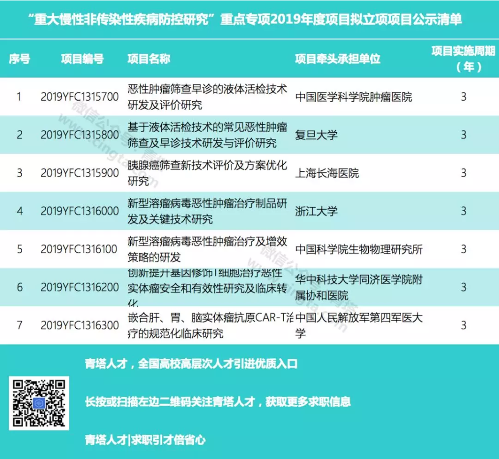 2019年本专项将结合前期的部署情况,以我国发病率和死亡率高的恶性肿瘤为研究对象,聚焦恶性 肿瘤筛查早诊早治研究和突破性诊疗新技术的研发,拟在液体活检技术研发、恶性肿瘤筛查方案优化与评价研究及恶性肿瘤新型免疫治疗技术研发三个方面,重点部署5个三级指南方向,拟支持项目 8 个,国拨经费总概算约 1.2 亿元,实施周期为2019 年—2021 年。