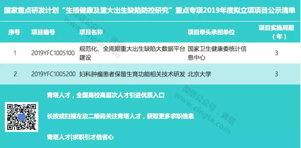 “生殖健康及重大出生缺陷防控研究”重点专项:2个项目